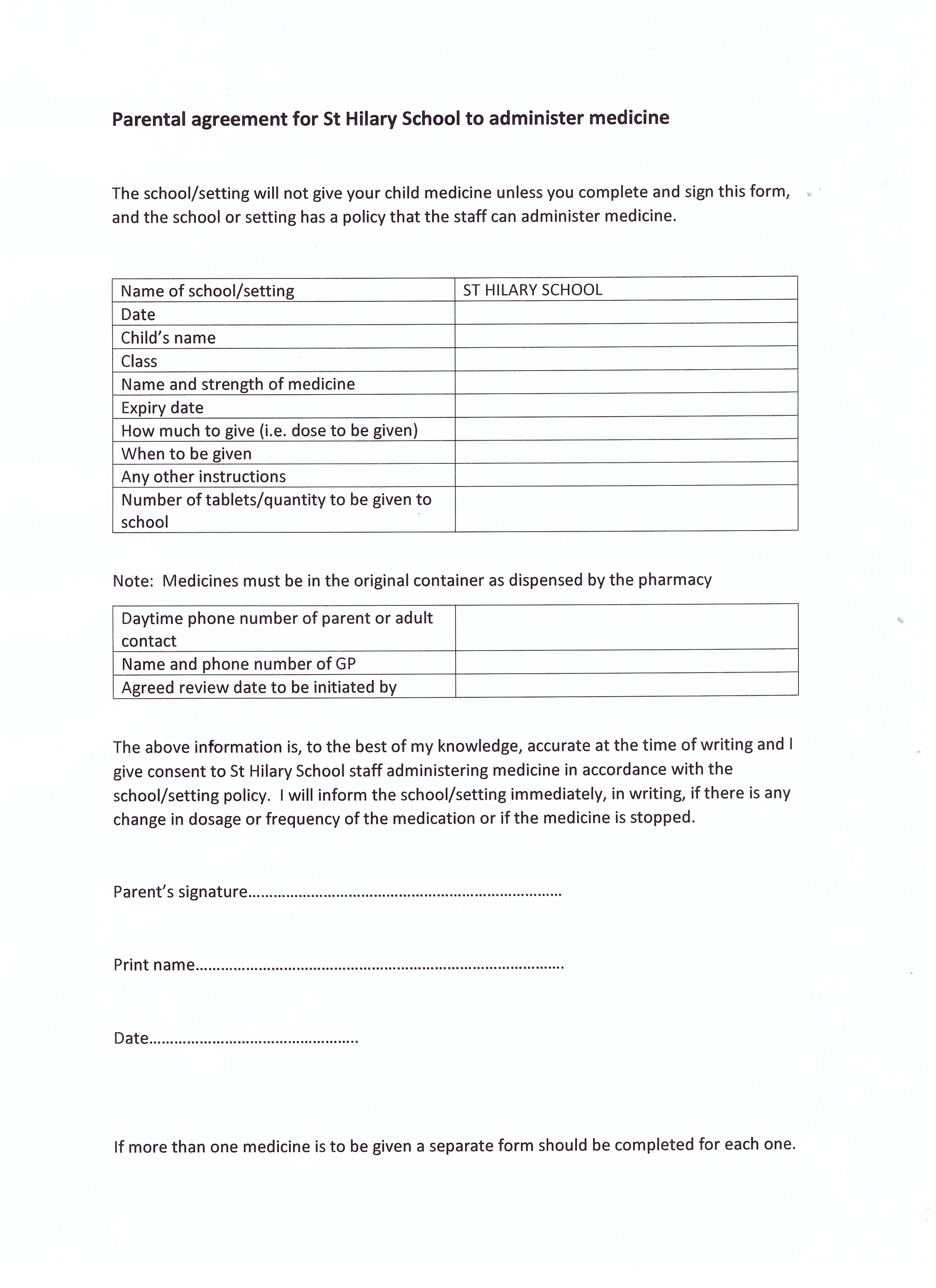 In order to be compliant with health and safety recommendations, medicines can only be administered at school after a 'Dispensation of medicine' form has been completed. Any medicine must be passed onto the class teacher or in the school office by an adult, along with the completed form.